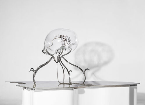 Such works unite metal tendrils (made of brass, steel, silver, and nickel, for example) with bulges of glass. Nudi Hallucination (2024), for instance, takes its name from one of the artist’s novels and features an alien form with stainless steel legs, topped with a brain-like bulb. Motifs Sent by the Future: Ripples from Afar (2025), with its swollen center and spindly metal stems sprouting from the core, resembles a cast of an otherworldly organ.
