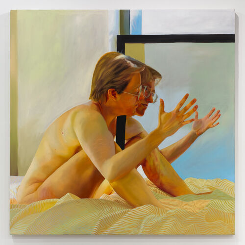 Linus Borgo’s paintings are informed by a near-death experience. At 18, Borgo suffered a devastating electrical shock from a generator that discharged 11,000 volts. Though he survived the incident, it necessitated the amputation of his left hand. This event, coupled with his lived experience as a transgender man, fundamentally informs a practice that deals with the pleasures and discomforts of embodied experience. Some of these works are on view in his solo show at New York’s Yossi Milo Gallery, “Into the Blue Again,” through April 25th.
