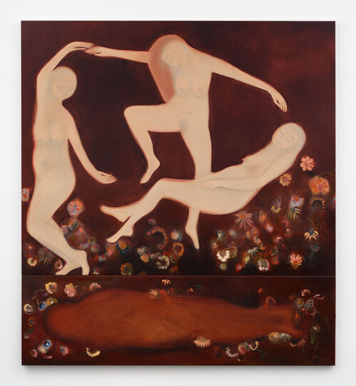 Diane Chappalley channels the Swiss mysticism from her region, rooted in esotericism and spirituality connected to the natural world, as she creates fantastical paintings and charged sculptures. Her works consistently depict feminine figures, often painted in neutral colors, in moments of spiritual encounter. Dense floral forms often cover their bodies and serve as a backdrop as they dance or meditate.