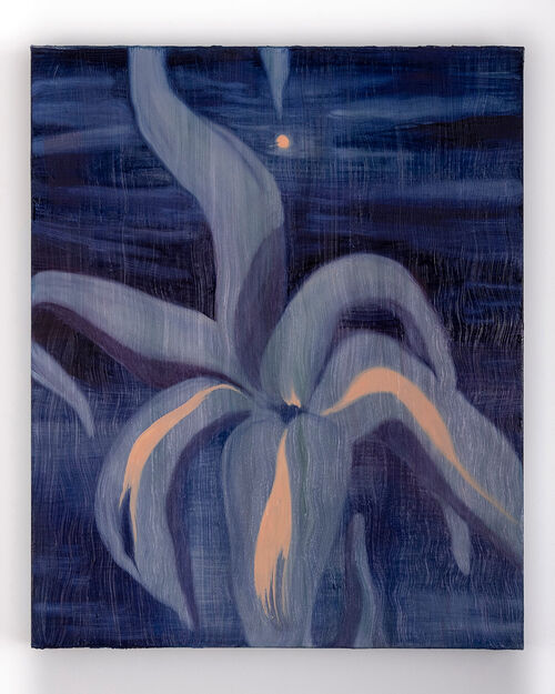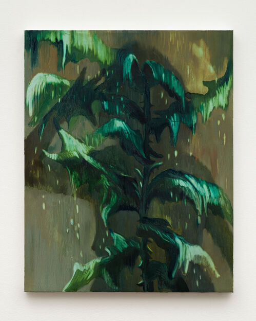 Many of Fernández’s luscious paintings feature a feminine shadow. Belong to Nature I (2025), for example, portrays an emerald-green plant shimmering in the rain and darkened by a woman’s silhouette. Here, the artist creates a self-portrait that underscores her watchful relationship with her natural subjects. Meanwhile, other works focus exclusively on striking ecological beauty. Fernández captures a wilting Midnight flower (2025), contorted under the glowing moonlight. And from a greater distance, in Paradise Memory I (2025), she depicts a lavish grove through a thick brush.