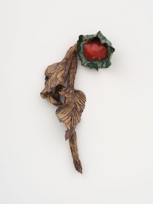 La Danse (2025), for example, features three women prancing across a field of blooms that sprout from a deep red backdrop. Below them, a blurred, spectral shape suggests a link to a spiritual realm. Chappalley similarly channels her mystical sensibility into sculptures, including her “Anxious Flowers” series. Anxious Flowers III (2025), a glazed stoneware of a dying flower with a bright red bulb, resembles a sacred totem more than a dying organic form. Later this year, new works will be the subject of a digital solo show with Taymour Grahne Projects.
