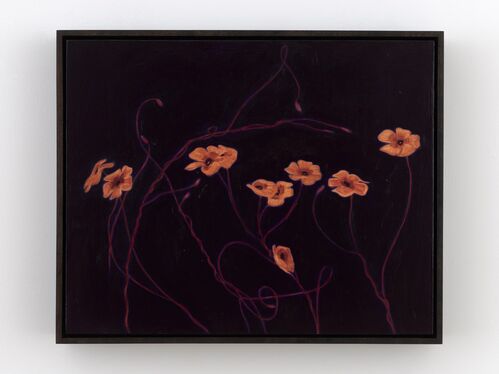 A selection of Tarver’s latest flower paintings are currently on view at Nino Mier Gallery in New York as part of her solo show, “Dedicated to the low in heart,” her first with the gallery. Though the artist once based her paintings on store-bought blooms, she now looks to flowers that spring from the concrete in different cities, which she denotes in her titles. These works position the flowers as markers of resilience and growth. nights, 98/Mexico City (2026), for instance, features a cluster of ocher flowers and looping reddish stems floating against a dark, velvety background. Tarver isolates the bouquet, appreciating their endurance in the inhospitable city.