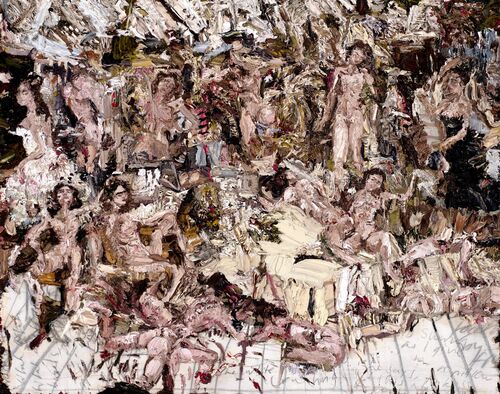 In her current solo show at Saatchi Yates in London—a precursor to a presentation at the Sainsbury Centre for Visual Arts later this year—the canvases teem with figures. The artist and Lilah appear again and again: entangled, tumbling, in repose, suspended between reverence and yearning.