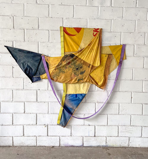Tepedino traveled from Rio de Janeiro to install the show, collaging the inside of the gallery’s windows with pages from old books to create an aura of mystery from the outside and a sense of intimacy within. The artworks on view demonstrate Tepedino’s material range—he’s known for repurposing found rubber, sails, beach bags, and more into wall-hanging relics like Sem título (2025) and garupa (2026). In the process, Tepedino reasserts the poetic, rather than functional, possibilities of everyday objects. Some works were shipped from Tepedino’s studio; others he made on site, placing Rio in conversation with L.A.
