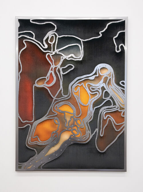 The works in “Chiaroscuro,” though, wield newfound drama. Houldsworth made most of them while participating in Italy’s esteemed Palazzo Monti residency last year. Both the 13th-century palazzo and the city of Brescia, Italy, beyond bear scores of historic frescoes. Houldsworth has turned their cinematic scenes into sparse segments of color, divided by steel traces. For example, After Reni, Bologna (2025) trades the artist’s more signature jewel tones for the brooding palettes of Italian Baroque legend Guido Reni, melting his moving scene into something minimal and obscure, suited to contemporary culture’s muddled cacophony.
