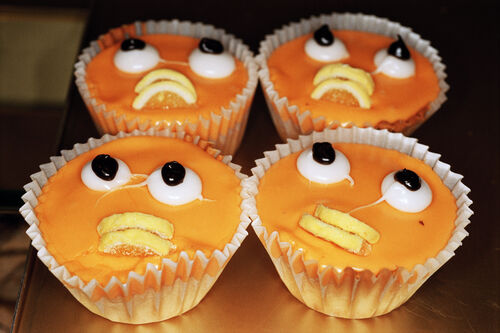 In this image, four bright orange cupcakes decorated with candy eyes line up in a shop display. The image exaggerates their artificial appearance, turning a familiar snack into something playful and alive.