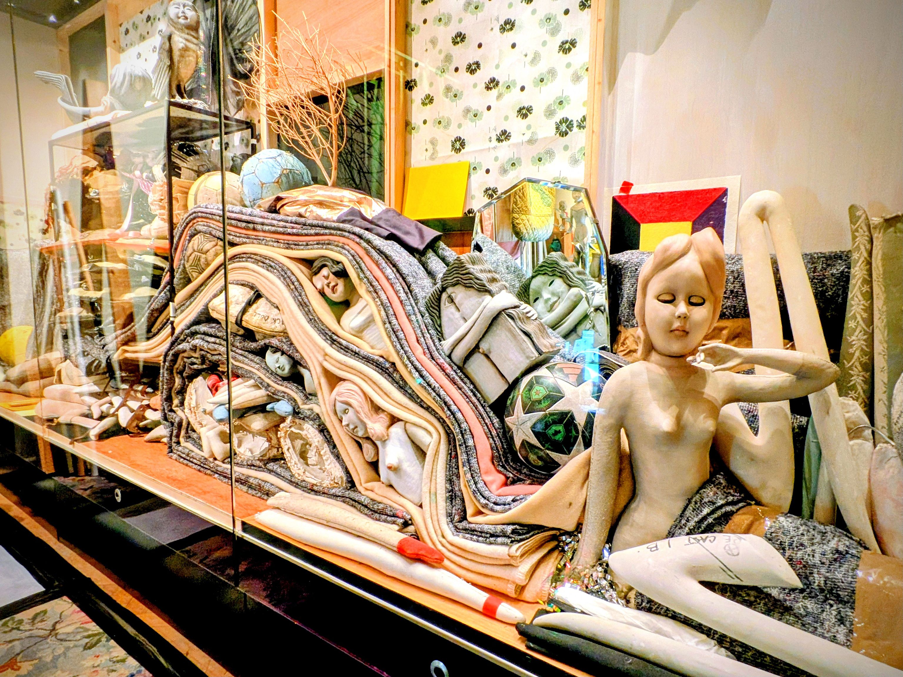 Amid the objects in Freud’s study it is initially hard to spot Pilkington’s sculptural interlopers. Peeping out from among the figurines on the desk is a polychrome statuette of a multi-breasted goddess with long white socks and dainty red shoes, while on a mahogany plinth previously occupied by a Roman bust, another miniature naked figurine strikes a pose in racy stilettos. A horse’s head and a faceless fur-collared female bust appear on a tabletop and disembodied plaster limbs nestle on folded blankets.