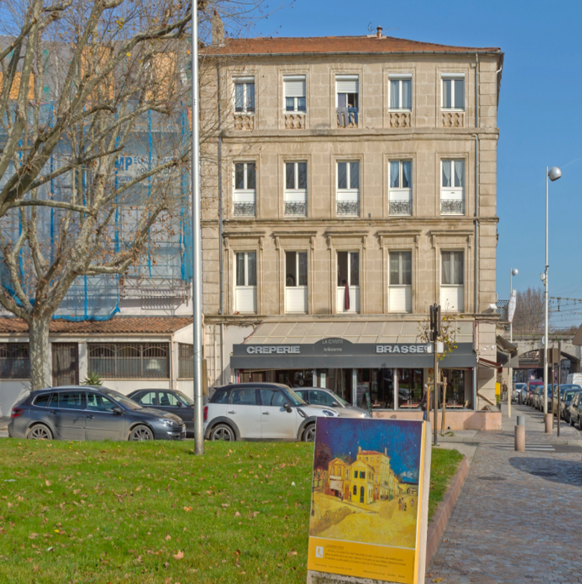 Where the Yellow House once stood: It was between the plaque and the street straight ahead (the taller building in Van Gogh’s painting still survives and appears in this photograph)
