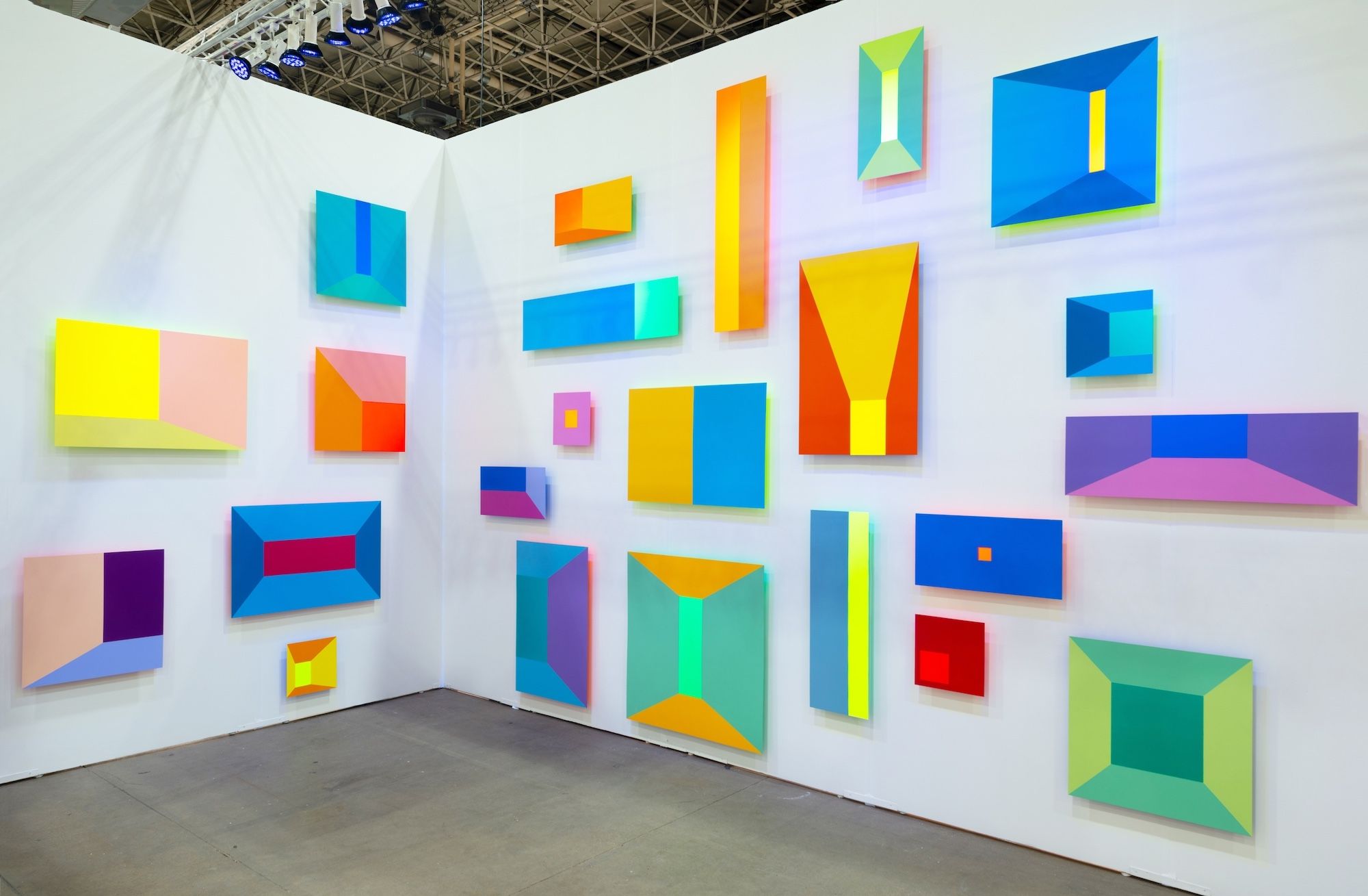 The longtime Chicago gallery Secrist Beach has one of the most magnetic stands in the general galleries sector thanks to a wall-filling installation of neon-hued geometric compositions on aluminium panels that is lit by black lights. Its patterns are based on the abstract stained-glass windows of Le Corbusier’s chapel in Ronchamp, France. The glowing installation, by the Chicagoan duo Luftwerk (Petra Bachmaier and Sean Gallero), is titled Open Frame (2025), priced at $150,000 and was acquired by the Nelson-Atkins Museum of Art in Kansas City during Thursday’s preview.