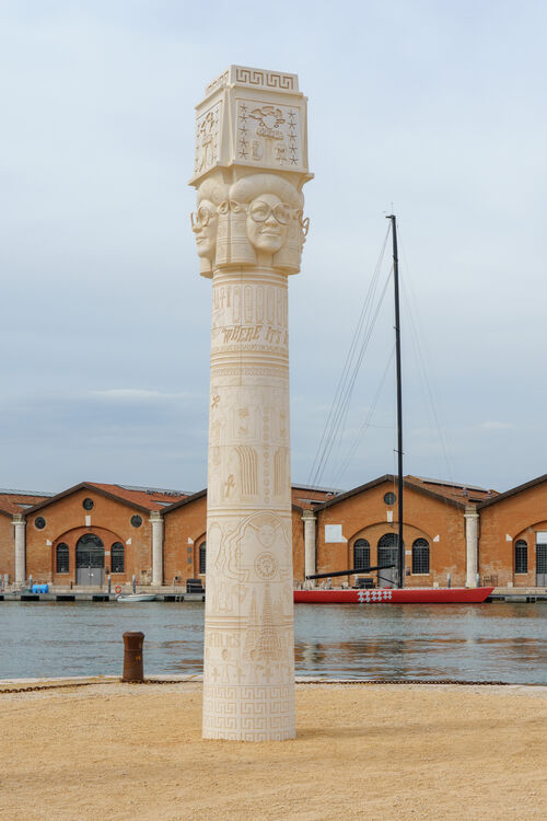 Meanwhile, Los Angeles–based artist Lauren Halsey’s keepers of the krown (antoinette grace halsey) (2024) pays homage to Halsey’s community in South Central Los Angeles with a massive column inscribed with local signs and advertisements. The column is topped with a portrait of the artist’s grandmother.