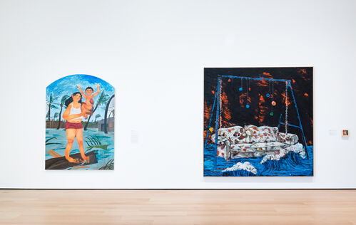 Some paintings in the exhibition address the plight of migrants crossing the United States border. Karla Diaz’s Uncle’s Crossing (2022) depicts the artist’s late uncle, who worked as a coyote, or someone paid to bring migrants across the U.S.-Mexico border. The work comes from her “Coyote” series, which Diaz says she began after her uncle’s death, as his profession, and the possible legal ramifications of speaking out about it, was a taboo subject in her household.