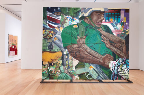 In line with Alvarez’s expansive curatorial approach, some of the included artworks are not paintings at all. Some reimagine folk and craft traditions, like Justin Favela’s St. Maarten (1972), After Marisol (2025–26), a mural made with the colored tissue paper often used to make piñatas. The piece references a seascape by the Venezuelan American artist Marisol, who features prominently in the museum’s collection. It continues Favela’s decades-long exploration of the piñata style, which he began as a student in protest of his professors urging him to make work about his Mexican Guatemalan heritage.