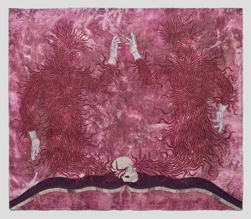 Some works consider the effects of imperialism and the exploitation of people and nature. Gamaliel Rodríguez’s painting Evolved Cavendish (2022) speaks to the slave trade in the Caribbean. Its subject is a rotting cavendish banana tree, a high-carb crop brought to Puerto Rico under Spanish colonial rule to feed enslaved people. Rodríguez uses the plant, which appears to be consumed with fungus, to draw parallels to Spanish colonization and consider how Puerto Rico has “changed and evolved” over the centuries, the artist said.