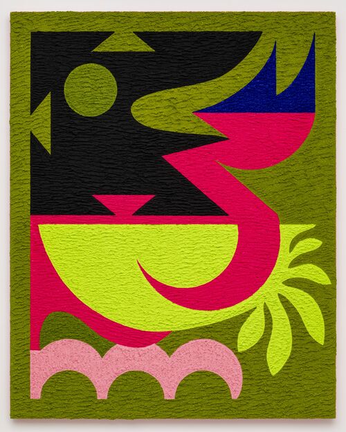 Other works have socioeconomic undertones, like Kristopher Raos’s hard-edge painting Untitled (No Escaping the Housework, All Temperature!) (2023), which depicts fragments of a detergent box painted in geometric color fields, reflecting on the visual markings of domestic labor in Latinx communities with a Pop art–like quality. Raos likens the “methodical process of labor” to artistic process. No one can “conceptualize how much goes into a work,” he said.