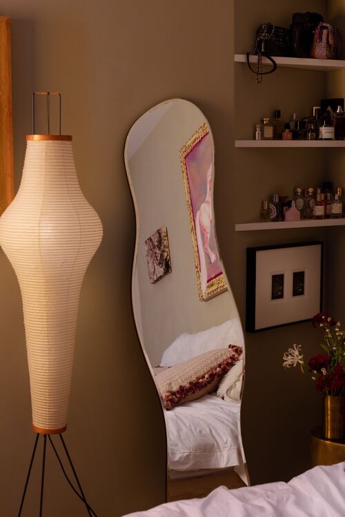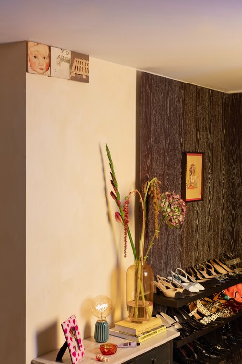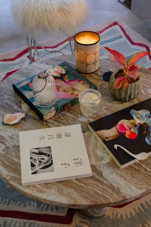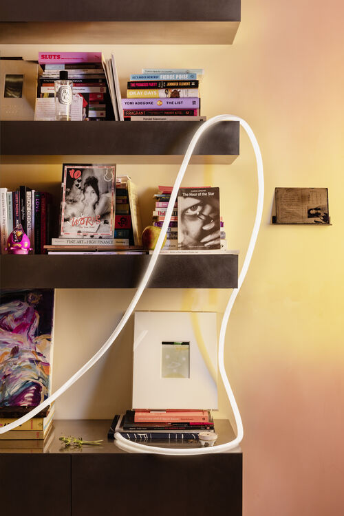 Growing up in Istanbul, she didn’t spend much time in museums until her teens. But once she started, it became an obsession. Today, her London flat reads like a reflection of this. Art books and catalogues are stacked high on the shelves, interrupted by sculptural lights and small works balanced between spines. The space glows with Eva Gold’s golden wall light, Open (2024). Nearby hangs a painting of a Turkish tea glass framed by an oversized rose by Tasneem Sarkez—a quiet nod to Surel’s heritage. On another shelf sit Graham Wiebe’s sliced book sculptures, their collaged titles forming strange poetic phrases.