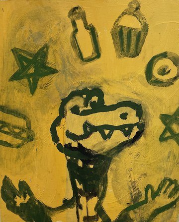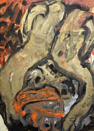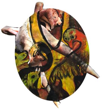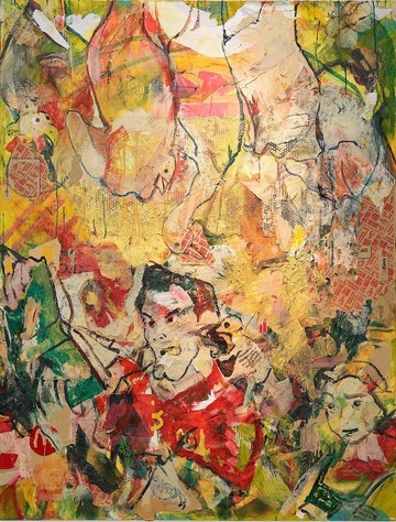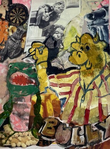 Indeed, Shah’s work is filled with contradictions, creating ambivalent and enigmatic storylines. In Bullseye, the word is imposed over a cheerful bull figure, subtly questioning power dynamics and (dis)honesty: Who holds the power? Who is the victim? In Half Full, a frenzied feast takes place—Shah flipped the canvas over several times during its creation, a process consuming more than a few years—producing a topsy-turvy landscape where up and down, left and right resist meaning. Beneath its playful surface lies an unsettling darkness: gushing blood-red tones, violent shards of light, and glimpses of infamous cartoon characters like Tom and Jerry buried beneath layers of paint. Their half-obscured fight points a haunting finger at hidden conflict and unresolved hurt. Shah’s work powerfully embodies how joy can quickly twist into terror, how consumption can spiral into excess, and how the line between light and shadow is often blurred.