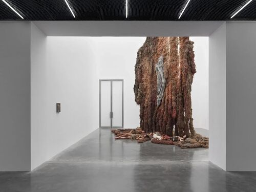 Hosnedlová, who lives and works in her small hometown of Uherské Hradiště, Czech Republic, is making the most of these international opportunities. In Bermondsey, she has taken over two galleries in the cavernous former warehouse. An enormous tapestry composed of thick strands of woven flax, linen, and hemp hangs from the ceiling of the smaller gallery. These matted tendrils, tinted with natural dyes in earth tones, are a recurring motif for Hosnedlová; she is drawn to materials that bring an organic vitality and meaningful provenance to her often stark venues. The fibers come from the last remaining linen factory in the Czech Republic; the pieces were woven by artisans at a Slovenian textile studio dedicated to preserving the region’s cultural heritage. Hosnedlová invited me to feel one of the faux locks, which was surprisingly soft and airy. The artist loves it when visitors want to touch her work, though institutions rarely allow it.