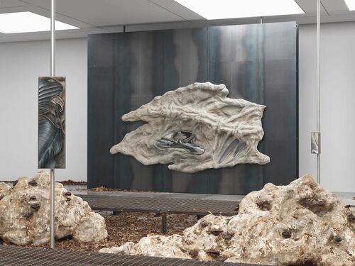 A resin sculpture, coated in stone and mineral dust, nestles in the center of the tapestry. It resembles an ancient fossil and gestures towards Hosnedlová’s fascination with remaking the past. And in a niche of the sculpture, a small, curved panel of embroidery appears, recalling her own creative beginnings—needle and thread in fact led Hosnedlová to artmaking. “When I was a child, I often made clothes for myself and my family, and I always felt so relaxed,” she said. But when she arrived at the Academy of Fine Arts in Prague, in 2009, she found herself in an extremely “old-fashioned” and male-dominated environment. Craft-based practices weren’t taken seriously. Hosnedlová attempted to conform to the dominant trend for abstract painting but quickly realized that “if I wasn’t enjoying the process, there was no point.” She reverted to her origins, developing her unique strategy for defamiliarizing a centuries-old craft tradition.