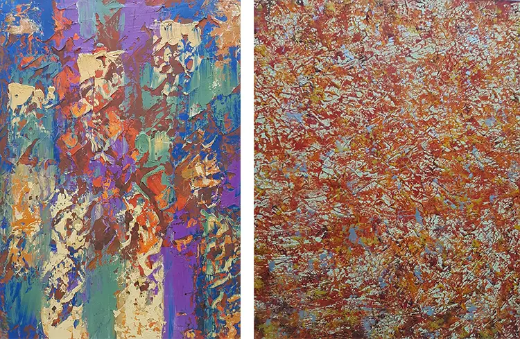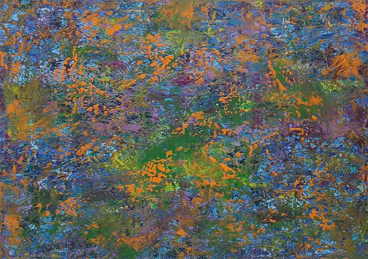 Other works explore nature as a symbolic expression of inner life. “The Good of Nature” presents green tones that evoke growth and renewal, while a warm golden brown center suggests sunlight nourishing the earth. Thick textures recall forest trunks and dense foliage, creating the sensation of standing within a quiet woodland environment. “Flowery Meadow” uses vibrant blues, purples, turquoises, and oranges to recreate the exuberant vitality of a blooming field. Dynamic brushstrokes and layered paint give the impression that flowers are dancing in the wind, celebrating the freedom and abundance of the natural world.