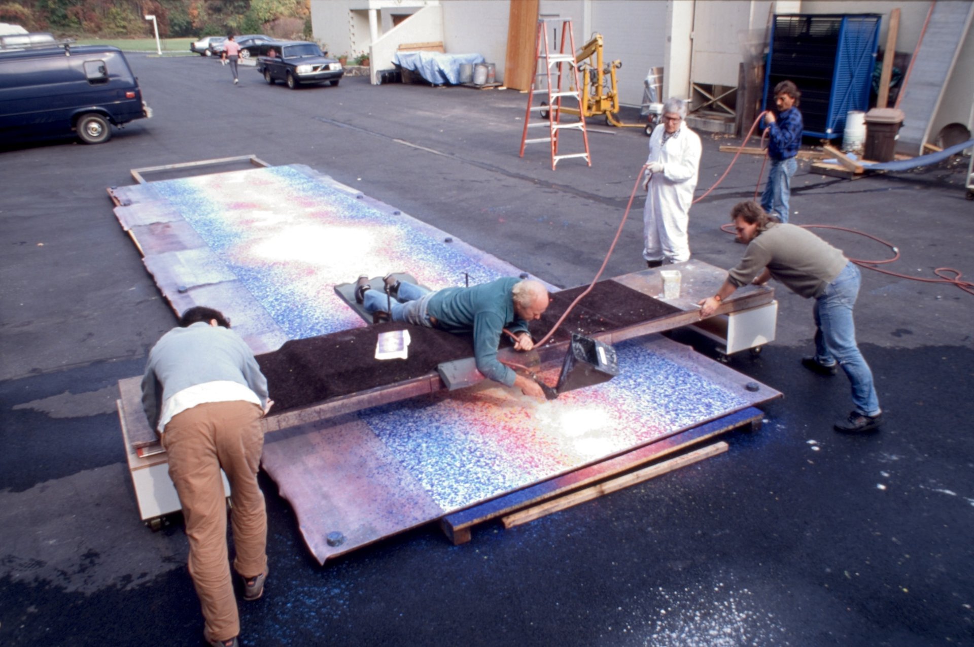 James Rosenquist, on top of a moving platform held by Paul Stillpass and Michael Mueller, using a pattern pistol to spray coloured paper pulp onto base sheets for Time Dust (1992), assisted by Kenneth Tyler and an unidentified person, in the Tyler Graphics workshop driveway, Mount Kisco, New York, in 1990. National Gallery of Australia, Kamberri/Canberra, Gift of Kenneth Tyler 2002. Photo: Marabeth Cohen-Tyler