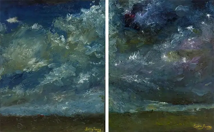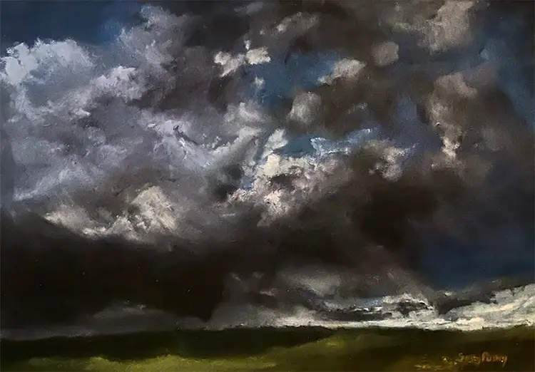 Central to Pulley’s visual language is a commitment to openness and uncertainty. His storm-filled landscapes, in particular, avoid clarifying whether weather systems are approaching or fading, or whether danger has passed or is still forming. That refusal to resolve the moment keeps the work suspended, inviting viewers to project their own emotional and experiential contexts into the scene. Although the paintings are abstracted, they remain grounded in observation, drawing from direct engagement with land, sky, and shifting atmospheric conditions. Alongside these landscapes, his floral works explore impermanence through the lens of ichigo ichie, a concept that recognizes each moment as unrepeatable and deserving of full attention. These paintings honor not only peak beauty but also transition, decline, and the quieter forms of presence that often go unnoticed.