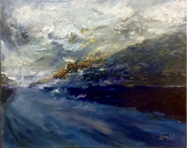 Alongside this expansive storm painting, Pulley often references Wedding Hydrangeas, an oil painting on board that attends to a more intimate register. Instead of depicting a specific event, the work focuses on presence and attention, allowing memory to surface indirectly through color, gesture, and restraint. Like What Hath, it avoids explanation, choosing instead to hold meaning gently and allow it to unfold over time. Together, these paintings reflect his approach to art not as depiction but as condition. They invite viewers to remain present with ambiguity and to recognize that significance often resides in what is left unsaid. Through both scale and subtlety, Pulley demonstrates how openness can carry emotional depth.