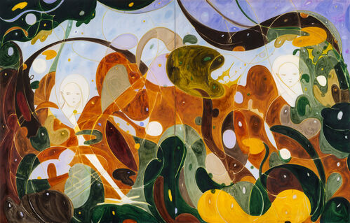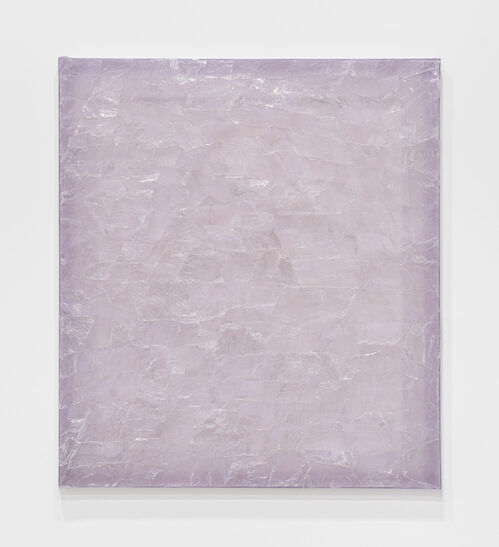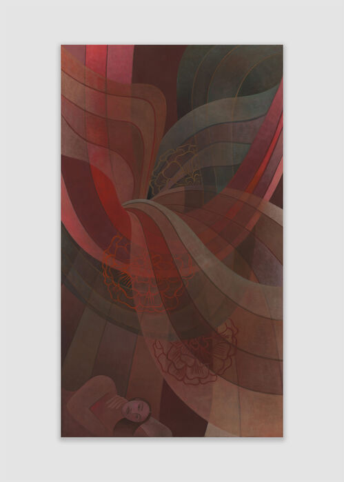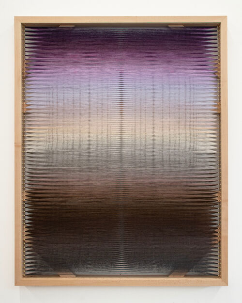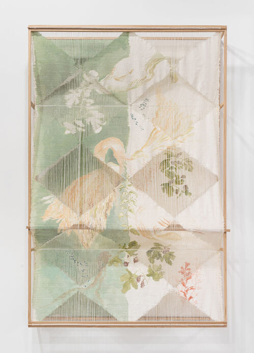 French artist Élise Peroi—featured in The Artsy Vanguard 2026—presents Songes II (2022), one of the artist’s deconstructed tapestries, where narrow strips of silk cut from her own paintings are woven onto wooden armatures. Meanwhile, on the back wall of the booth, Yulia Iosilzon’s painting Being Present With Ironic Approach (2025) depicts a mythical scene in which rotund and colorful forms are layered in the artist’s whimsical palette. These are accompanied by New York–based artist Rosalind Tallmadge’s mirrored mica wall works, where shattered, silvery paintings emerge as energetic “anti-images,” as the artist told Artsy last year.