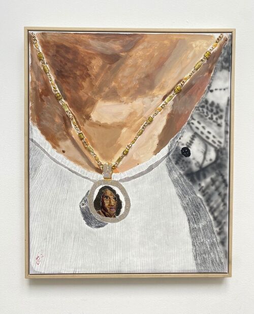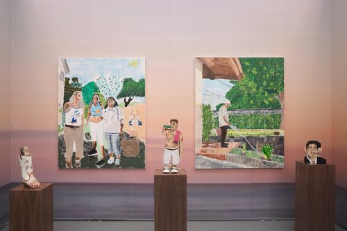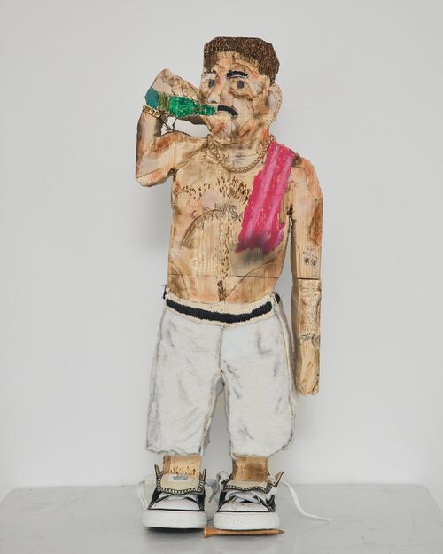 The artist has also expanded his practice to include wooden sculptures that depict faces and figures carved from Salvadorian wood he transported back to the U.S. One of these, titled Mi Primer Chela (2025), depicts the artist’s father drinking beer. “With my art, I shine a light to be an example who they champion not just for the family’s legacy, but for my people, ancestors, and those who come after me,” Rivas told Artsy. Works in the booth range in price from $3,000 to $25,000.