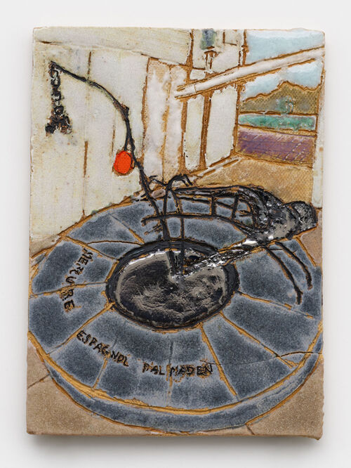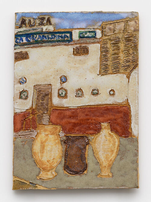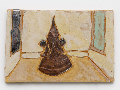 Taiwanese American artist Raina Lee’s palm-sized stoneware wall works draw from her everyday life, featuring subjects that range from koi fish to a still life from Casa Vicens in Barcelona.