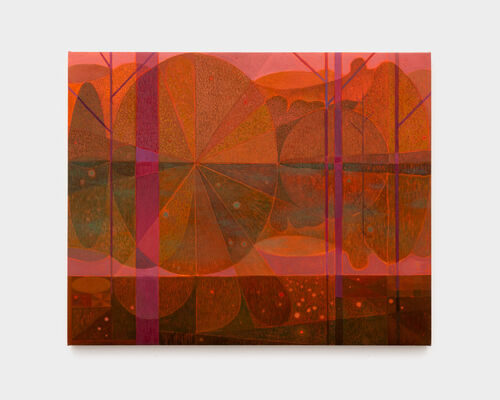 Meanwhile, Aaron Glasson incorporates handmade pigments from natural materials such as rust and charcoal, extending his interest in ecology and the relationship between humans and the environments they inhabit. Works like the crimson-toned Dawn at Chapultepec Lake (2025) recast a landscape through precise shapes and calibrated color relationships. Lastly, Matt Phillips constructs geometric abstractions from repeated shapes and layered, hand-mixed color, drawing on strategies such as quilting. These paintings are often inspired by organic forms, including Blue Flowers (2025), featuring petaled oscillations of blue and red.