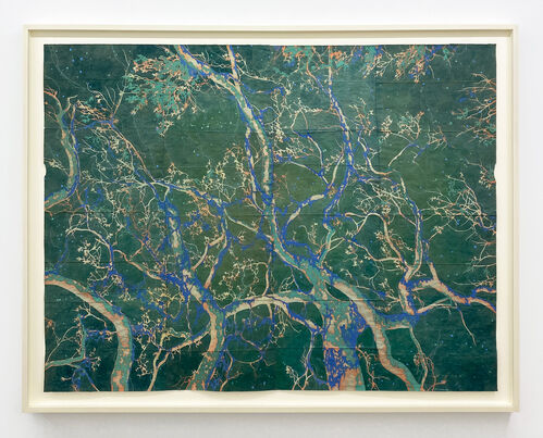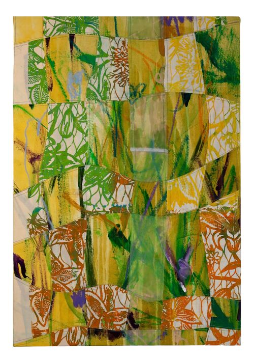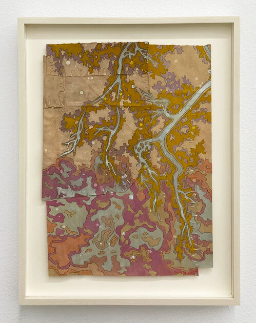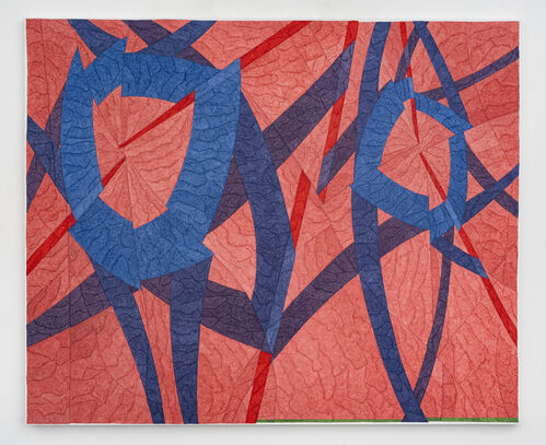 Craddock paints her organic forms on grocery-store paper bags, stitching them together into patchwork canvases. Evoking the elegance of Japanese woodcuts, the works are meticulously layered in gouache, lending a delicate luminosity to the humble surface.