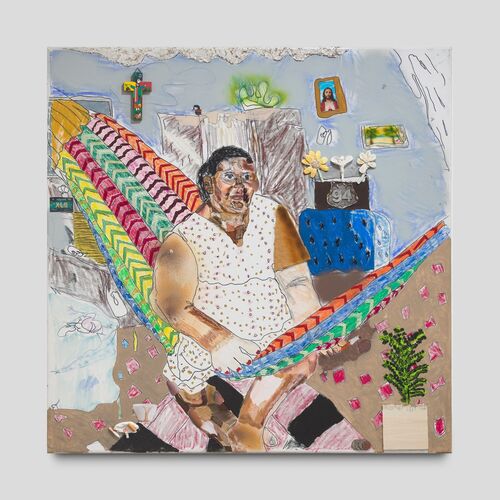 Hung against this sentimental backdrop is a collection of multimedia portraits that channel the enduring love Rivas holds for his heritage. In Mi Favorito Lugar (2025)—embellished with patches, clay, a wooden cross, crayons, and more—Rivas honors his grandmother’s house, a site central to his memory and identity.