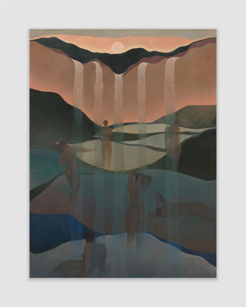 Laura Berger’s compositions feature stylized figures in pared-back, dreamlike environments. Berger initially approached paintings as a form of therapy, using portraiture as a way to consider interpersonal connection and self-reflection in nature. Soft Wash (2025), for instance, depicts six nude figures bathing in the waterfall, rendered with muted colors that lend a tranquil emotion.