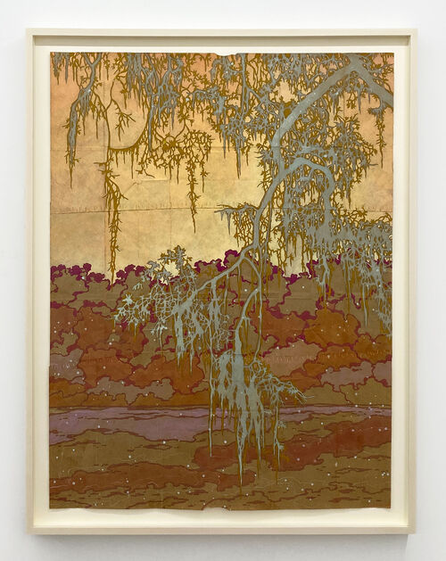 Each painting imbues trees with a personal emotional resonance, drawn from the artist’s own archive of place and memory. In Every Waiting Heart (2025), for instance, a tree leans into a marsh-like landscape, draped in Spanish moss against a sunlit horizon.