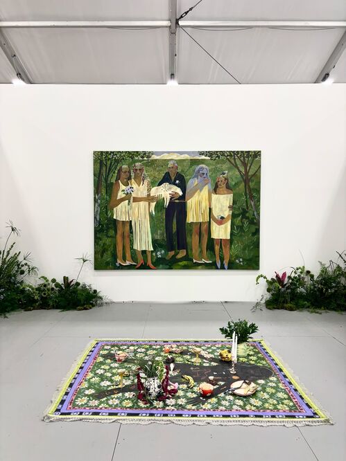 Colombian artist Lorena Torres channels the ache of a recent romantic loss in her solo booth with SGR Galería. Spread onto the floor is FAREWELL LIGHT, MAY HEAVEN KEEP YOU (2025), an oil painting depicting a figure lying amid a bed of flowers. The work is covered with ceramic objects, including a bird skull and bananas, each of which represents aspects of her relationship.