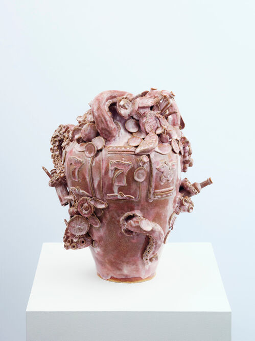 Positioned near the entrance of the Untitled tent, Kent, U.K.–based Carl Freedman Gallery showcases five visceral, defiantly “ugly” ceramics by British sculptor Lindsey Mendick. Each work—priced at $23,000—is encrusted with symbols of vice and luck: alcohol shooters, lemons, slot machine numbers. Mendick’s sculptures revel in the unruly beauty of excess.