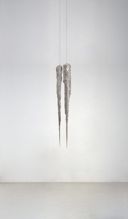 Three hanging sculptures line the front of Amsterdam-based Enari Gallery’s booth. Part of Dimitris Tampakis’s “Charmides” series, the two aluminum dagger-like casts represent figures that chime upon impact, embodying what gallery founder Christina Voulgari describes as “philosophical tension and ritualized intellectual conflict.”