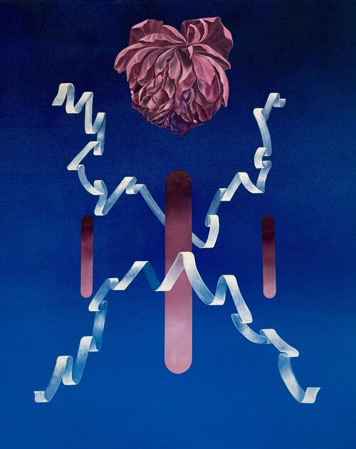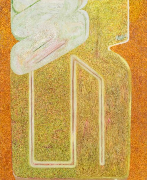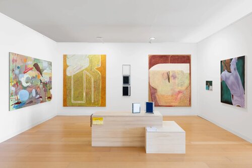 Subjects of distance and intimacy run throughout Berlin-based gallery Kornfeld’s booth. First to make an impression is Charlie Stein’s Virtually Yours (Kiss) (2025), a cloudy lavender canvas depicting two bodies, covered entirely in black and pink puffer jackets, embracing one another. Completely anonymous beneath their cushioned surfaces, the figures are unable to fully touch each other, a metaphor for the isolation brought about by technology: even when deeply communicating, we’re distanced.