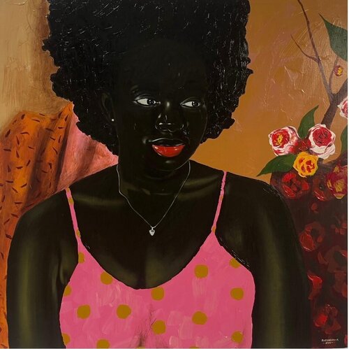 Elsewhere, several of Olasunkanmi Akomolehin’s oil paintings portray members of his Nigerian family and friends, both alone and together. Set against vivid, floral backgrounds, these characters exude a warm, if posed, conviviality.