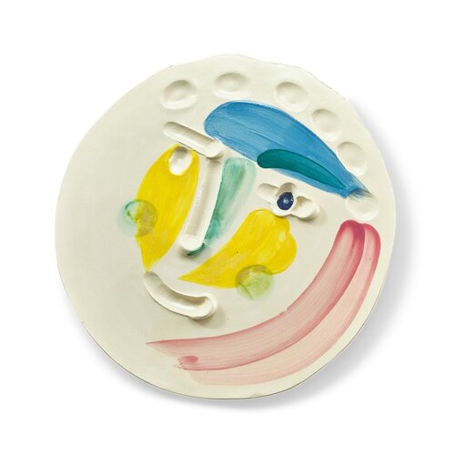 One plate shows a grumpy pair of black eyebrows, with a gestural splodge of a long red nose. Another, more minimal design, depicts a simple sunflower in olive and noir. They are part of a set of 20 ceramic “Visage” plates by Pablo Picasso, on offer at Bastian’s booth for a total of around €400,000 ($469,456).