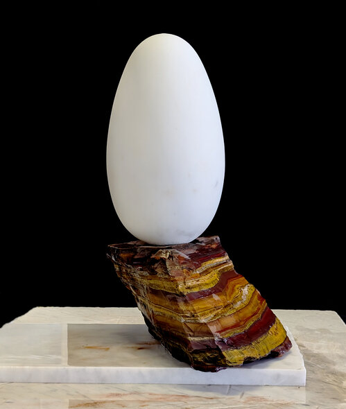 The booth also presents a wide range of works by Swedish-Ukrainian artist Nathalia Edenmont, including both analog photography and sculpture. In an earlier series, she created large-scale portrait photos of her subjects in voluminous dresses exploding with flowers. More recently, she’s begun taking photos of goose eggs, their shells gently cracked but their insides not visible to the viewer. According to a gallery representative, these delicate works are a response to Edelmond’s own experience with fertility: a theme she continues in her sculptures in marble, onyx, tiger’s-eye, and jasper stone, each priced between €32,000 ($37,556) and €37,000 ($43,424).