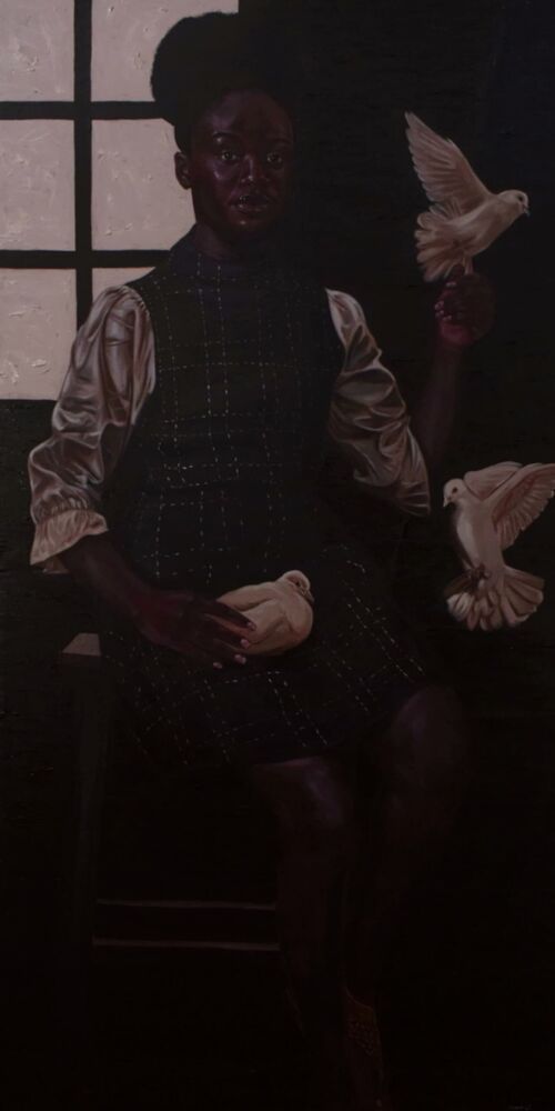 Nigerian painter Enoch Jr Chinweuba said he stumbled upon the format intuitively a couple of years ago when he was drawn to the sight of two side-by-side 40-by-40-centimeter stretchers in the studio, together appearing as if one long, narrow canvas. This led him to begin working with single canvases of similar dimensions. While he considered this might be a risky move considering the conventional formats favored by curators and collectors, he wanted to be “true to [his] desire to explore”. His 2024 acrylic painting The Comforter, Spirit of the Deep is rich with shadow, showing a young woman surrounded by doves. Here, Chinweuba wanted to “place a special kind of focus on the muse,” adding “the entire painting feels like a doorway” through which the viewer might bring their own ideas about the subject and her narrative.