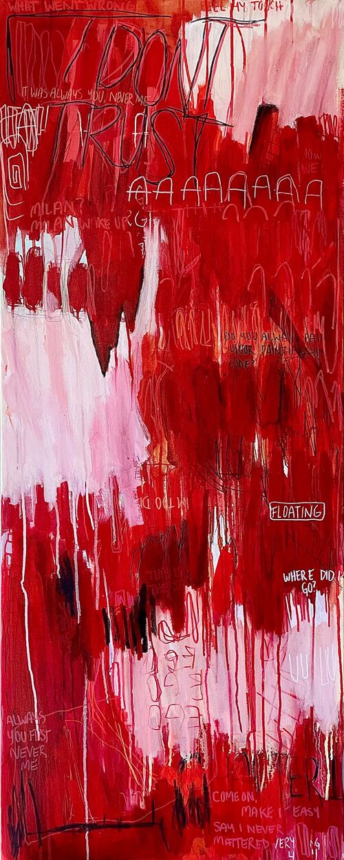 With their unconventional proportions and unusual use of space, ultra-vertical paintings trigger immediate attention from a visually fatigued audience. Whether they reveal or conceal more than we would usually see on a canvas, these works toy with our expectations and make us take another look. “The paintings frustrate because they refuse full disclosure,” said Giovanelli. “This combination—bodily confrontation paired with visual withholding—produces something that is simultaneously frustrating, enchanting, and mysterious.”