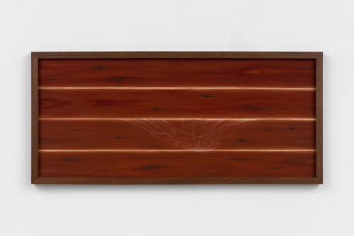 Charlotte Edey is also inspired by the verticality of religious art. At Ginny on Frederick’s booth at Frieze London 2024, the British artist presented eight long, narrow, mixed-media works that surrounded the booth. Their tall shapes were divided up into sections by fine panels of wood meant to reference doors and stained-glass windows, in Edey’s words, “forming portals to exit throughout the booth.” In her current solo exhibition at James Cohen in New York, unusually narrow works will hang both vertically and horizontally. “Elongation is a narrative tool that implies passage, sort of storyboarding, to establish a choreography of looking across the work as if it were unfolding over time,” she said in an interview.