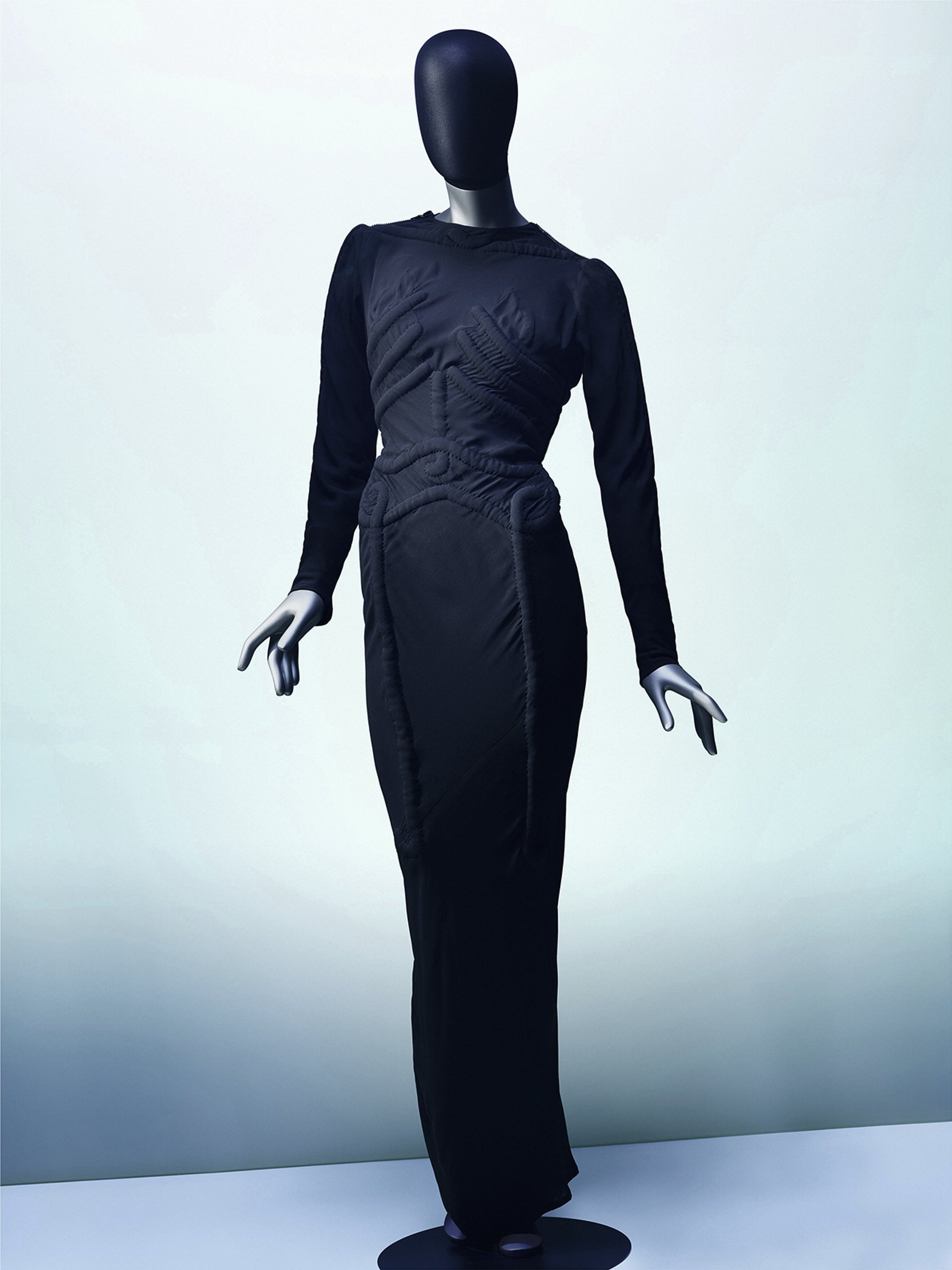 The most surprising exhibit in London’s Victoria and Albert Museum (V&A)’s latest blockbuster fashion show, which opened on 28 March, is a radically quiet sweater. Fine-gauge yarn in stockingstitch, it is black with white strands that float across the rows inside and caught every few stitches so a spark shows. At the neck is a naive sketch of a collar with a soft bow—a black outline filled in with white. It is almost a century old, yet perpetually modern.