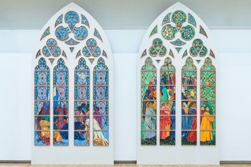 The outward direction has gained increasing importance for Tabouret in recent years: at the 2022 Venice Biennale, she participated in the Pavilion of the Holy See (Vatican City’s Pavilion), painting intimate portraits of female prisoners’ children and loved ones from photographs they sent her. “For the first time, I was painting something that was not coming from my own story,” she said, “and putting myself at the service of others.” She connects this experience with her current commission for the Notre Dame windows, where she is interpreting the story of the Pentecost—the day the Holy Spirit descended upon Jesus’s apostles and followers in Jerusalem, marking the birth of the Christian Church.