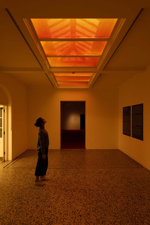 “I was more interested in chemistry, transformation and the spatial considerations that accompany the darkroom,” he said. He now approaches his sculptural practice with a “photographic sensibility.” In the exhibition, he filled a glass skylight with iodine (a light-sensitive substance used to make early daguerreotypes), to bathe the space in an orange hue. Over time, the orange color washed out thanks to the substance’s instability.