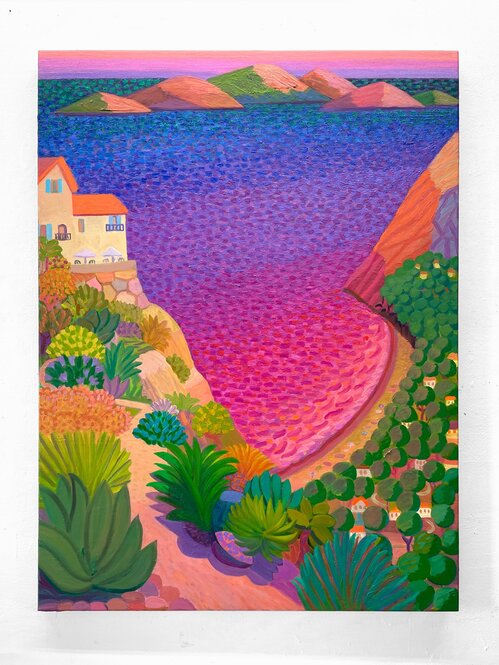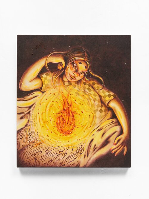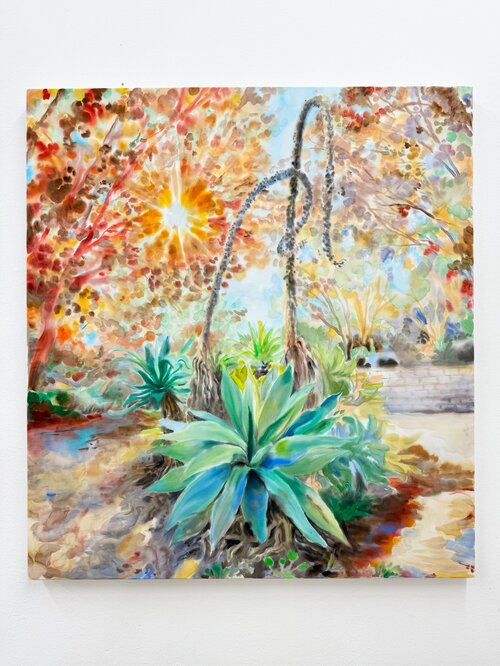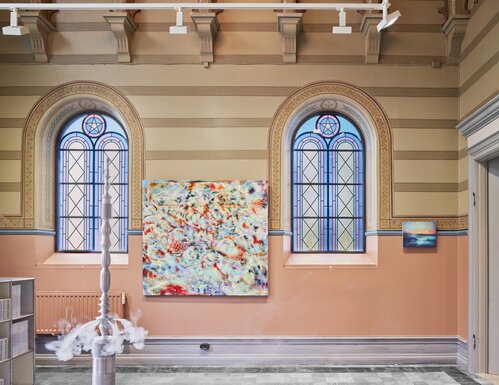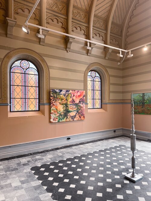 The chapel in Lund brings the gallery’s ethos into sharper focus. As with the exhibition at El Royale, the work is set in direct dialogue with the building. This setting illuminates the bright, explosive colors that characterize most of this group show, such as Jean Nagai’s Goat Mountain (2025), a textured pumice-on-canvas work that evokes a burning flame, or Alice Faloretti’s psychedelic landscape, Mirage #2 (2025). Compared to its first iteration in L.A., this show feels less compressed, bending to the chapel’s rhythm while still linking the gallery’s program across continents.