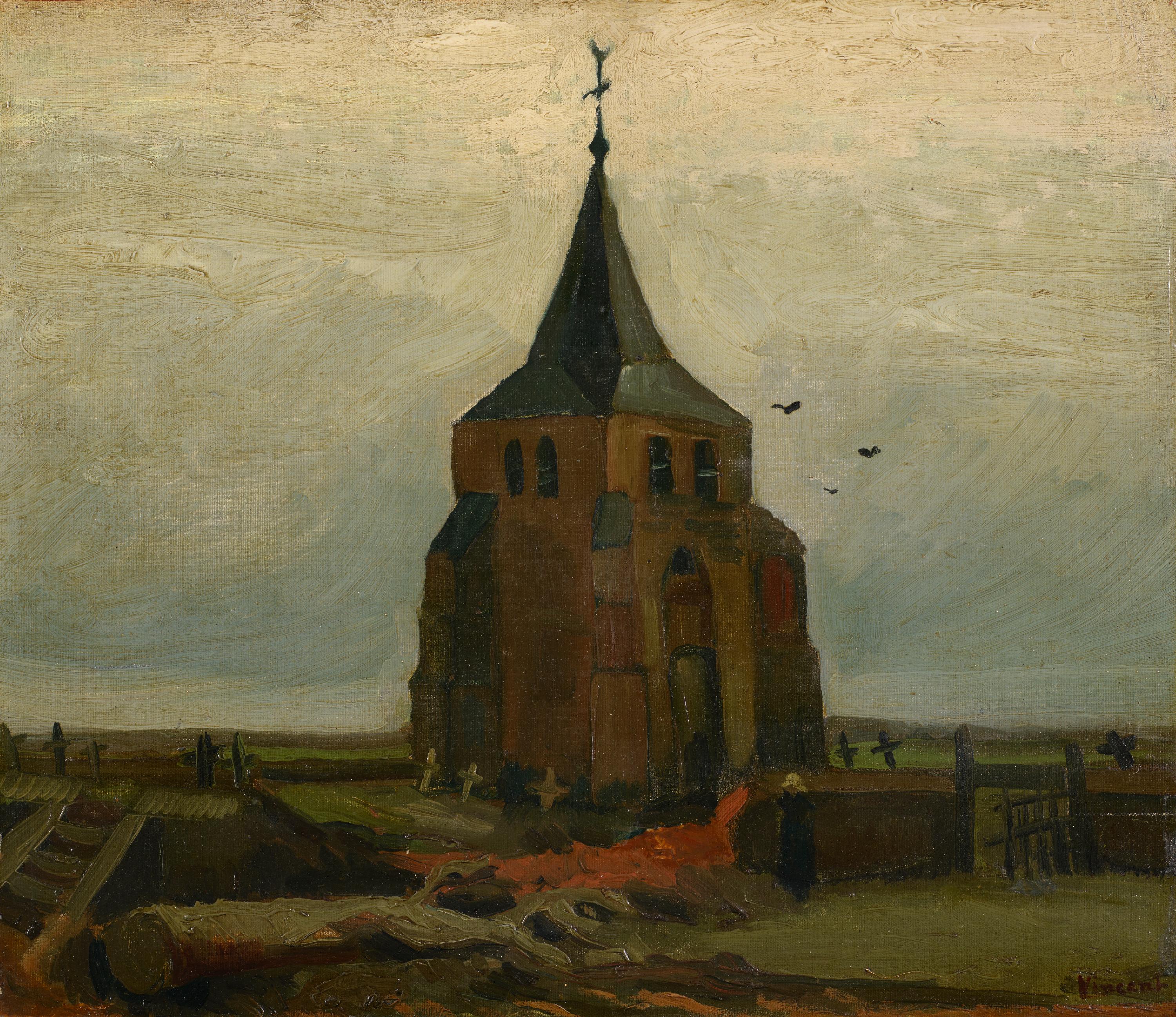 The Old Tower (July 1884), painted in Nuenen, depicts the tower of the church where Van Gogh’s father had served as pastor. His father had died in March, four months earlier, and had been buried in the cemetery surrounding the tower.