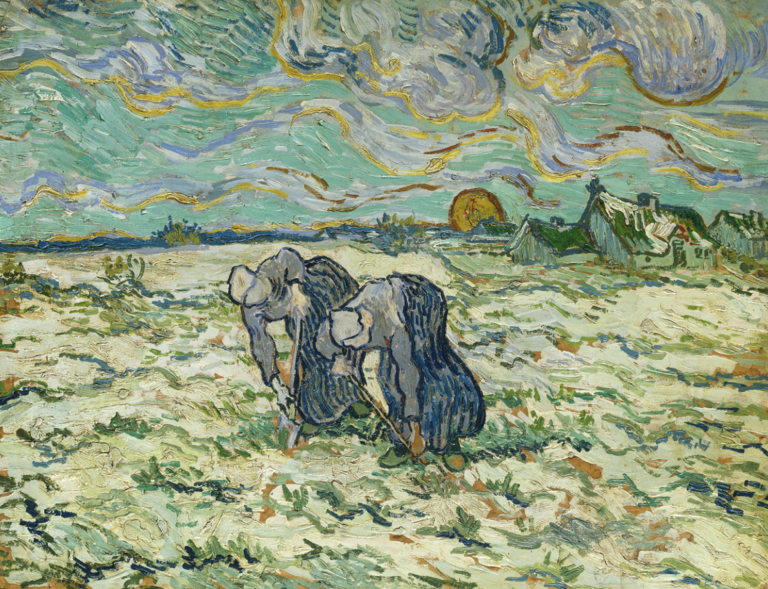 The Sower at Sunset (November 1888) is one of the two Van Gogh masterpieces in the Bührle Collection. Painted in Arles, the figure of the sower is based on a Jean-François Millet print greatly admired by Van Gogh. The enormous sun is almost a halo over the peasant. The cropped tree is a motif adopted from Japanese prints, another source of admiration for Van Gogh.